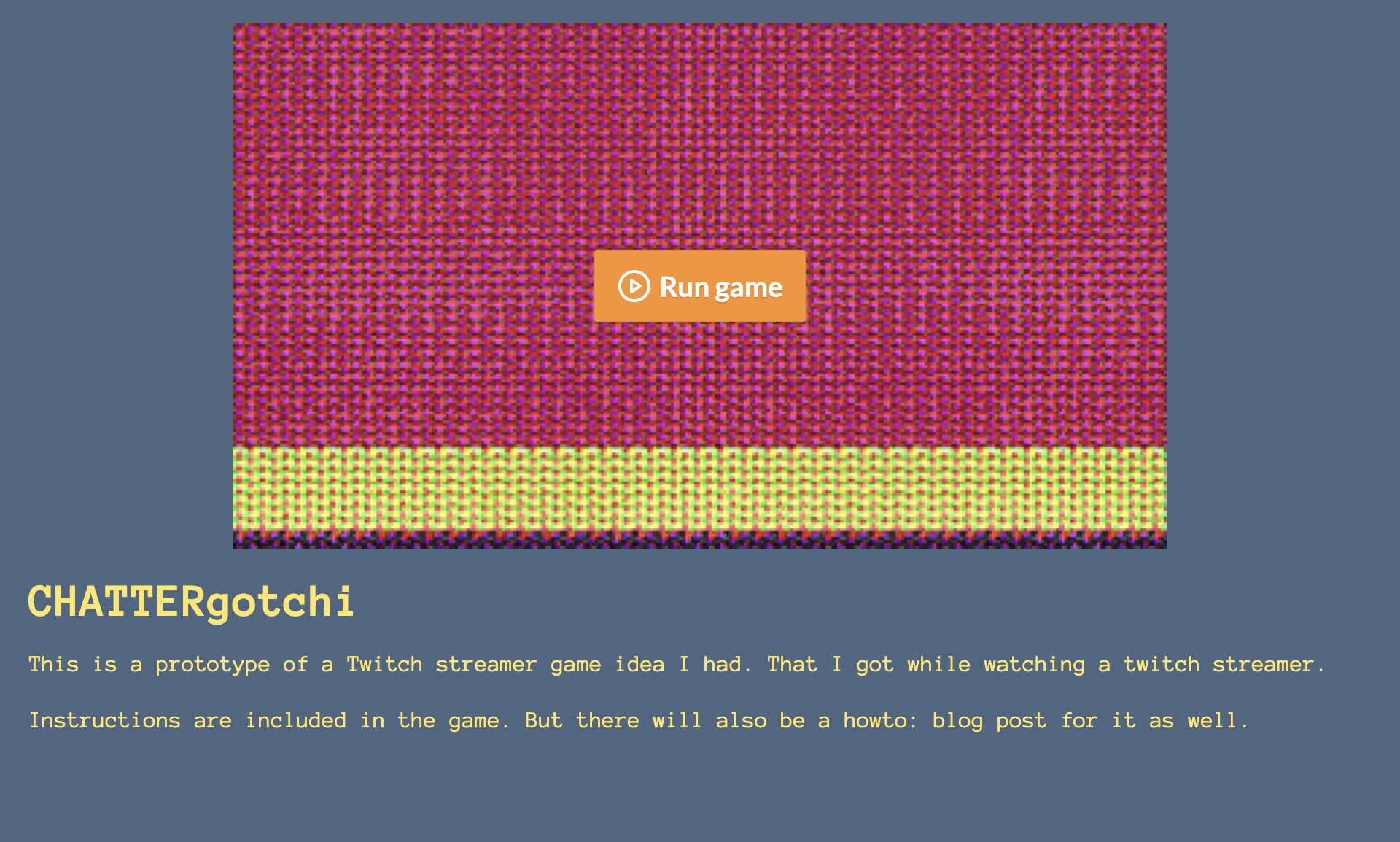 Start at: https://goldbuick.itch.io/chattergotchi and click the Run game button.